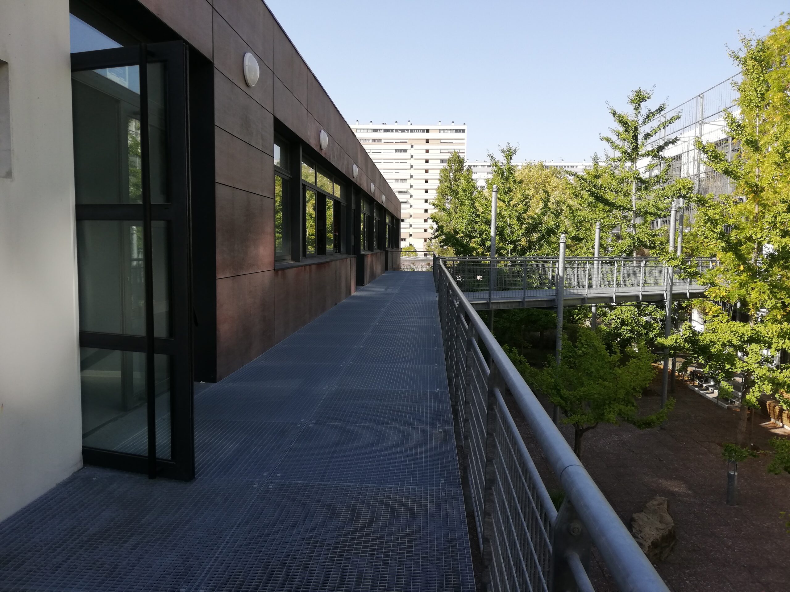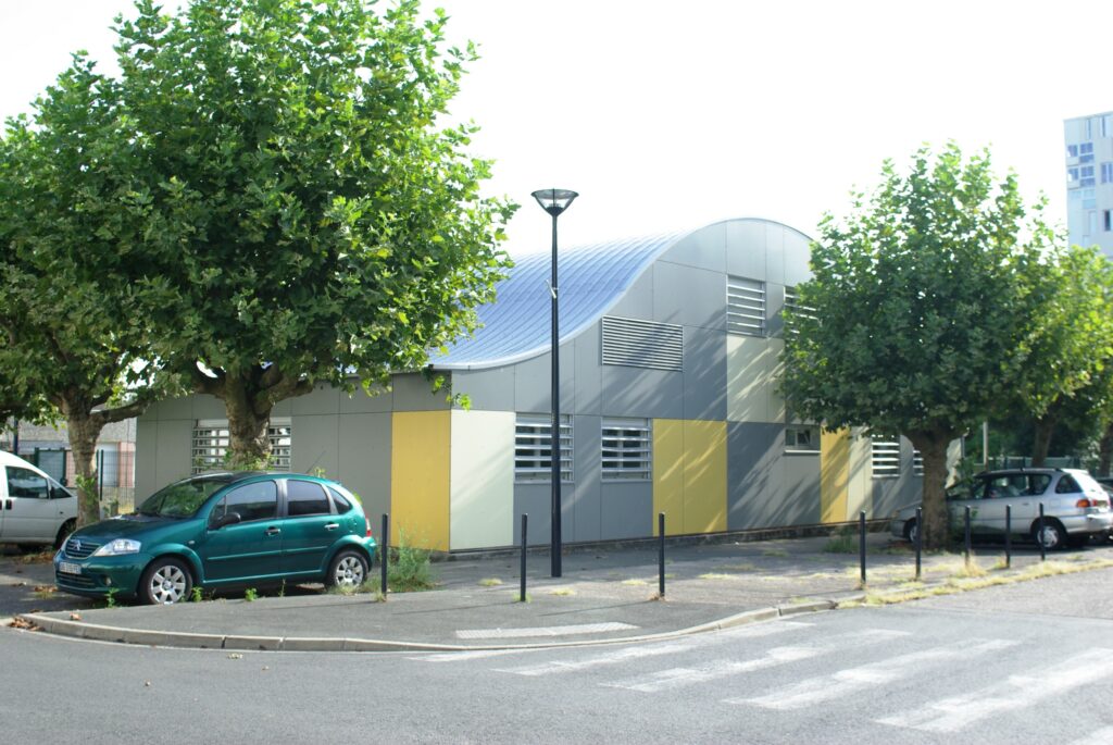 Ce bâtiment ferme la cour disposée à l’arrière du lycée, de type hangar industriel en charpente bardage et couverture métallique. La courbe de la toiture posée au sol forme la façade le long de la voie. Seules les trois autres façades sont pourvues d’ouverture donnant sur la cour.