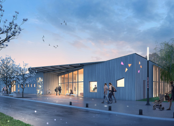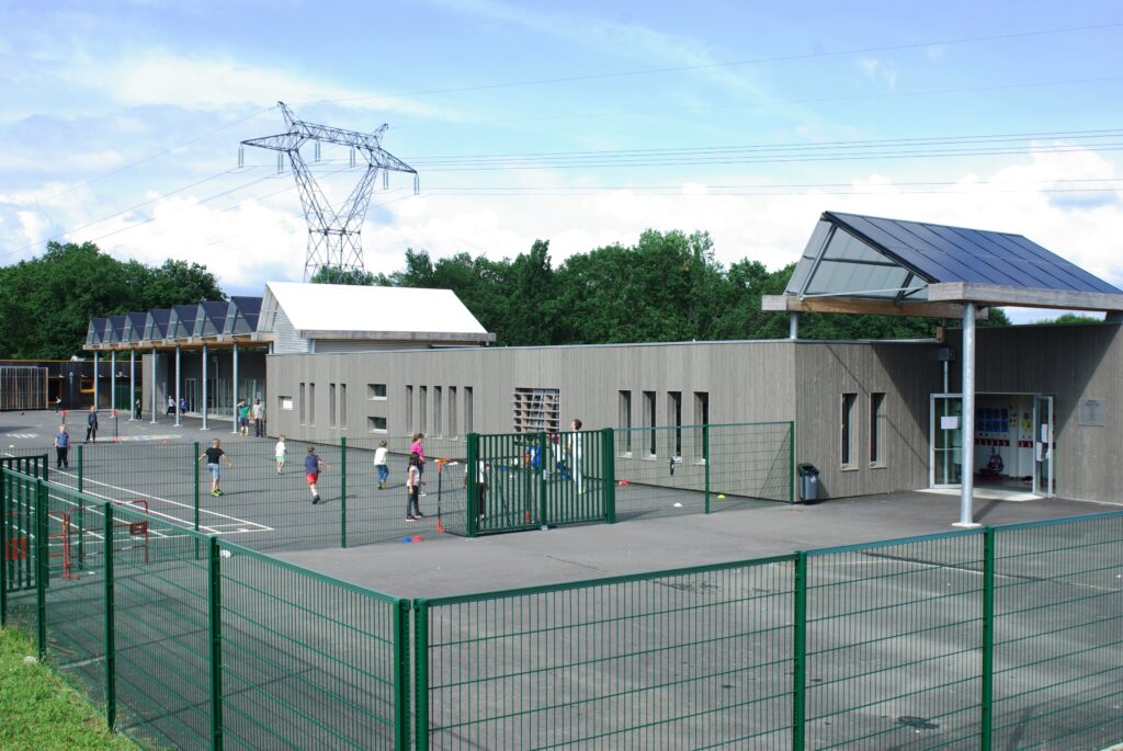 Construction d’une école primaire de 7 classes avec accueil périscolaire en extension du centre de loisirs existant. Le bâtiment est construite en murs préfabriqués MOB bardage extérieur à claire voie en carrelet traités antivieillissement par trempage selon des procédés écoresponsables exigés dans les cahiers des charges. Les classes sont disposées le long de la façade est donnant sur l’environnement naturel. Elles sont distribuées côté cour par une circulation linéaire se présentant en galerie vitrée sur la cour devant les classes élémentaires. Le préau est constitué d’une toiture en sheds couverte de panneaux photovoltaïque. Bâtiment BEPOS RT2012 non certifié.
