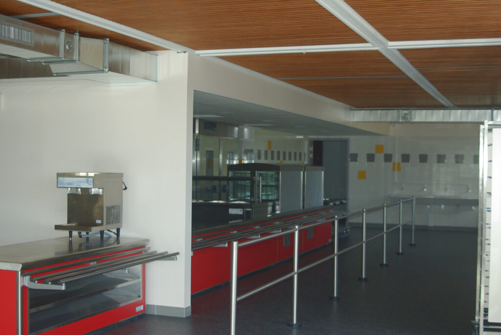 La rénovation du bâtiment de restauration présent sur le site constitue la première phase de l’opération du pôle éducatif Simone Veil. L’ensemble des salles à manger et des cuisines ont été entièrement restructurés. L’opération comprenait des travaux de désamiantage en phase démolition. L’ensemble sanitaire attenant a été entièrement reconstruit à cette occasion. L’ensemble du bâtiment a été recouvert d’un ITE couvert par le même bardage que celui du nouveau pôle éducatif en vis-à-vis. L’acoustique des salles à manger, de faible hauteur a été traitée grâce à des faux plafonds acoustiques en lames de bois ajouré, ajoutant au confort la présence d’un matériau chaleureux.