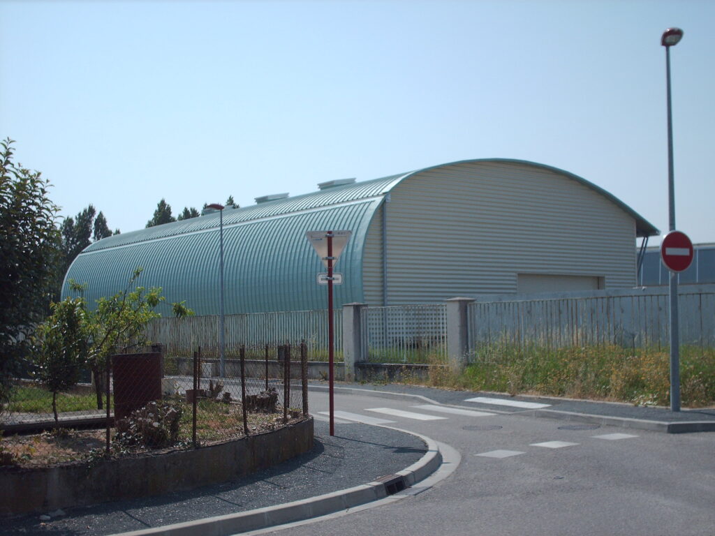 Il est constitué d’une charpente métallique en PRS avec couverture en bac cintrés formant façade sur la rue à l’arrière et le toit.